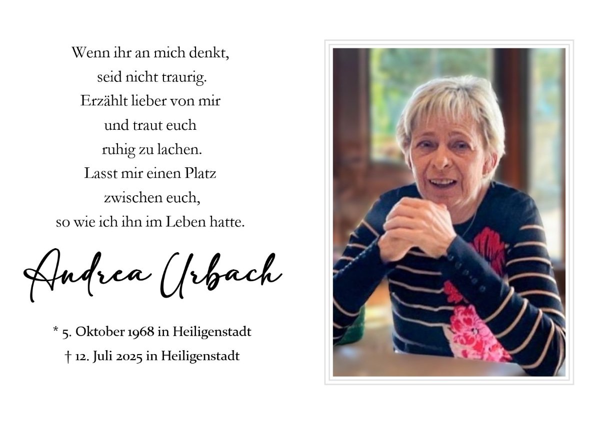 Lb. Familie Urbach, einen stillen Gruß aus dem Pfarrhaus Hüpstedt. Erst mussten Sie schweren Herzens von Ihrer geliebten Mutter Abschied nehmen und nun kam plötzlich und unerwartet die Todesnachricht von Ihrer Schwester, Schwägerin und Patentante Andrea.