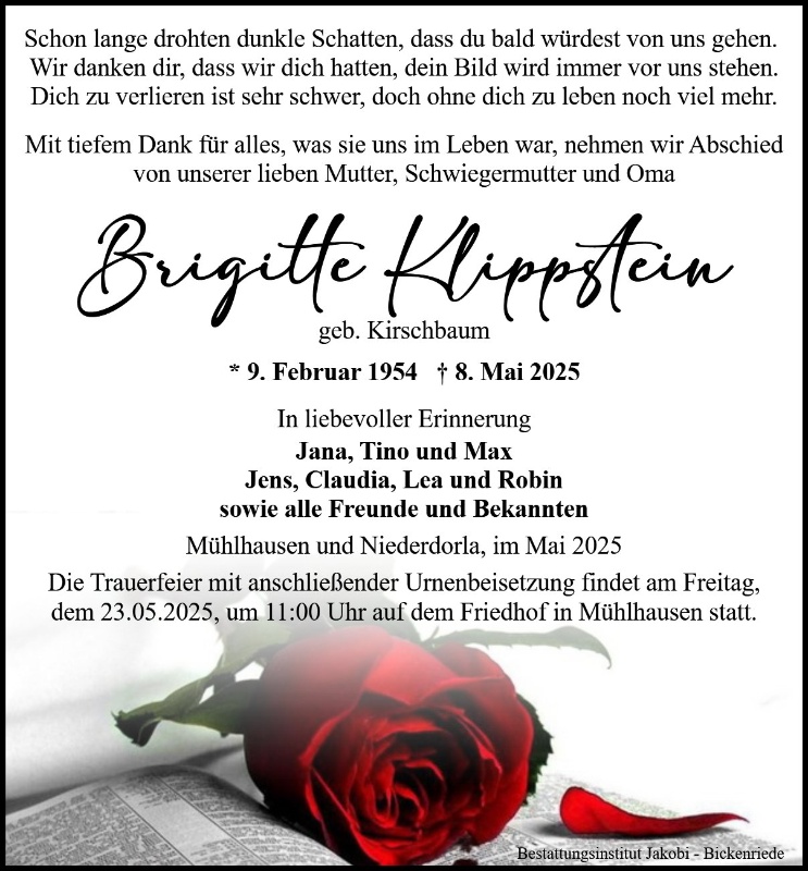mit dem Unbegreiflichen zu leben. Liebe Familie Klippstein, mit einem stillen Händedruck bekunden wir Ihnen unser aufrichtiges Beileid. Wir wünschen Ihnen viel Kraft für die Zeit des Abschieds und der Trauer.