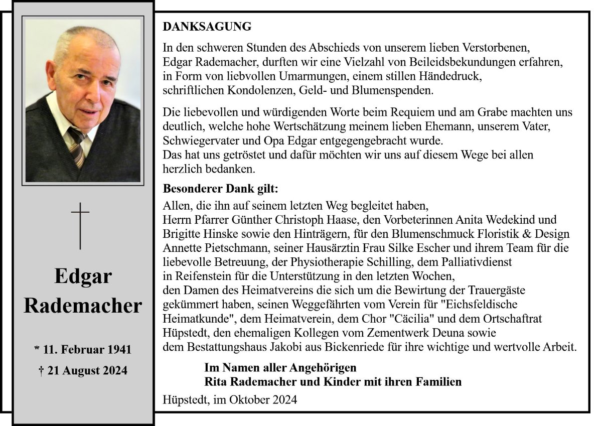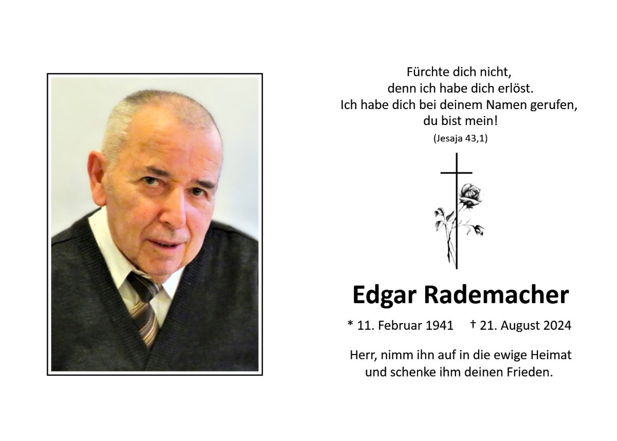Heute haben wir unter großer Anteilnahme Ihren geliebten Mann, Vater, Schwiegervater und Opa, Herrn Edgar Rademacher verabchiedet.