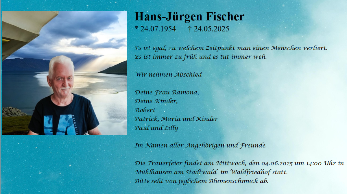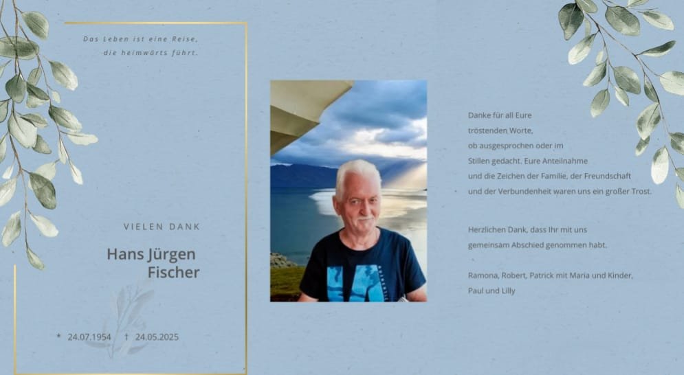 Liebe Ramona und Familie, es ist schwer bei einem solchen Anlass tröstende Worte zu finden,aber wir möchten Euch unsere herzliche Anteilnahme aussprechen und Euch viel Kraft und Zuversicht wünschen.