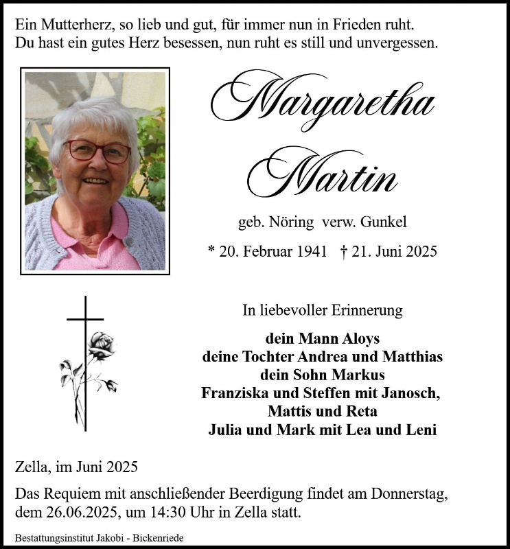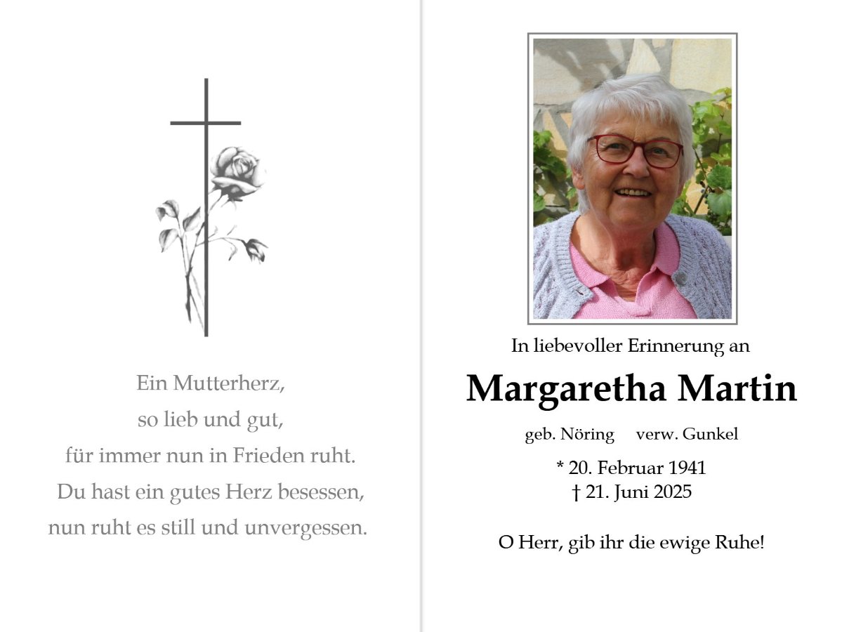 Gott wird das Leben Ihrer Frau, Mutter und Oma Margaretha in seinem Licht vollenden. Auch das, was unvollendet geblieben ist.