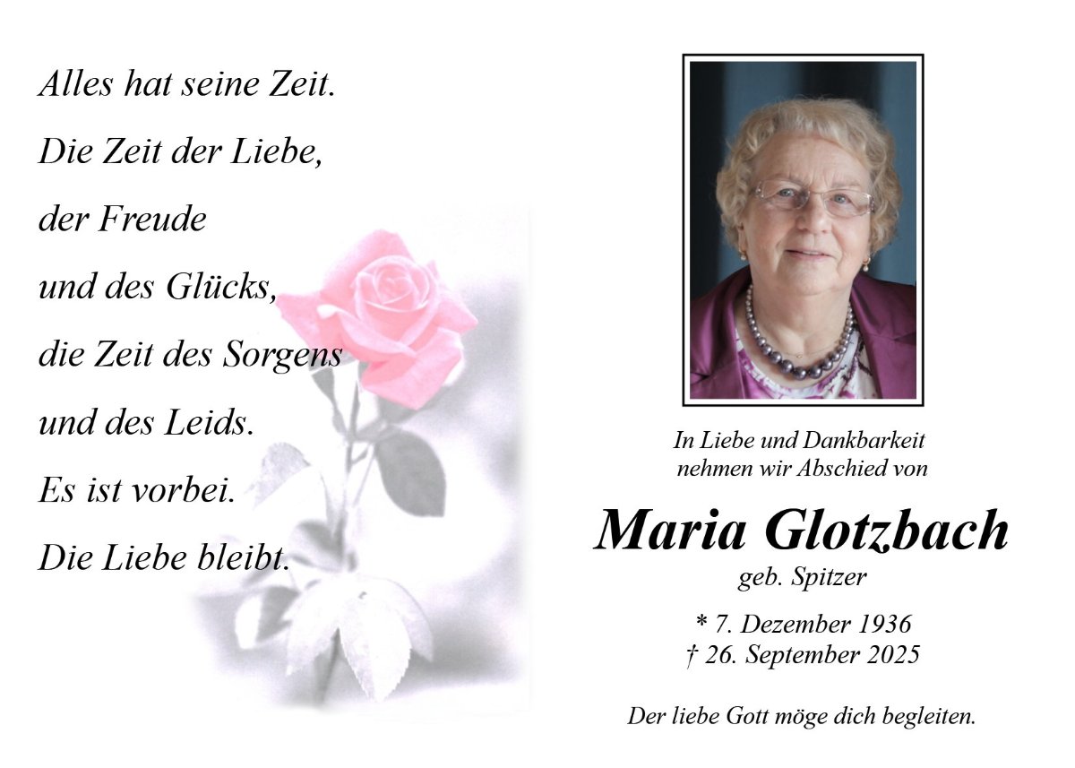 Liebe Angehörige von Frau Glotzbach , wir wünschen Ihnen in dieser schweren Zeit viel Kraft und Zuversicht in der Hoffnung auf ein Wiedersehen beim Herrn.