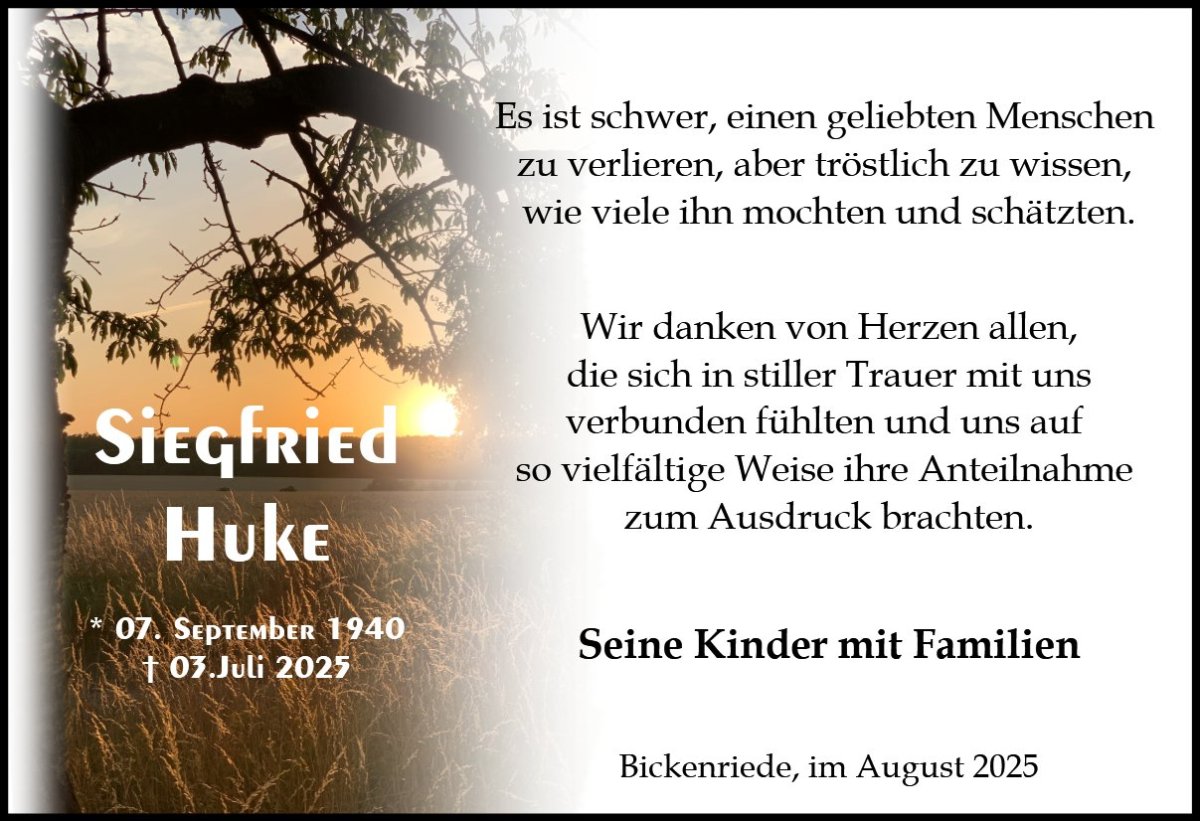 Liebe Familie Huke, erst heute haben wir erfahren, dass ihr lieber Vater , Schwiegervater und Opa verstorben ist. Sie wussten schon viel eher , dass er am gleichen Tag wie meine Mutter ins Himmlische Reich gerufen wurde und hatten bereits eine Kerze auf der Gedenkseite entzündet. Auch wir sind in Gedanken bei Ihnen und wünschen allen Kraft und Zuversicht in dieser Zeit .